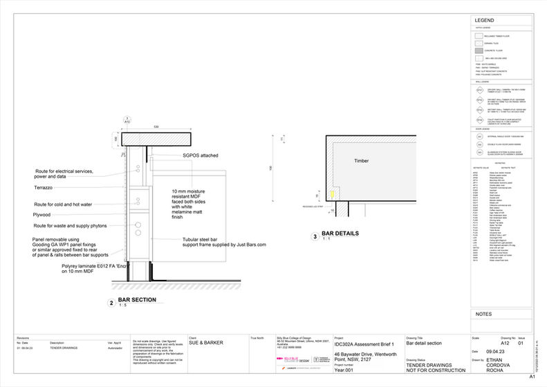 The space is defined by a main circulation pathway ( black dashed line ) that allows easy navigation between the bar, dining rooms 1 and 2, and the bike repair area.